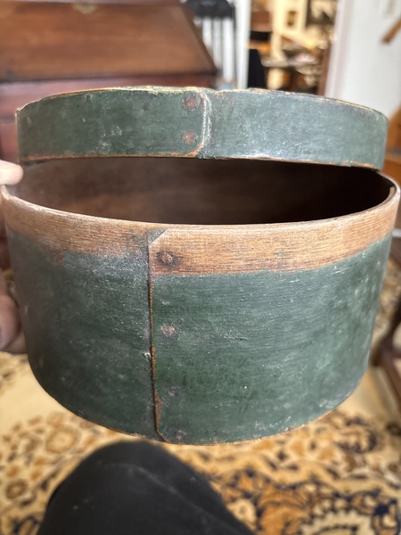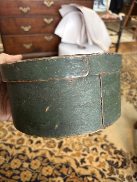 You just don’t see these boxes often this size either honest original painted surface. Look close at this only 5 3/4 by 2 inch tall pantry box. Has the best dry green original milk paint no damage or repairs .?early cut nails and wooden pegs !!! This box is cheap and honest! This has nice thick walls as well!!