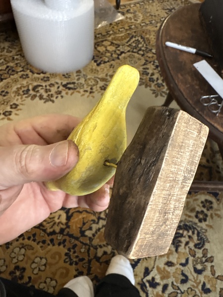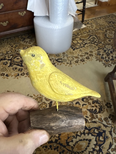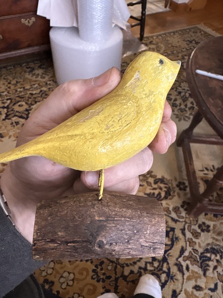 This has wonderful dry original yellow paint with an original piece of wood for base. Small size measuring 4 1/2 by 4 inches has super detail and carved raised eyes . These little folk art birds carved in Pa. In the 1850-1900 period. Love the untouched condition.