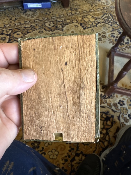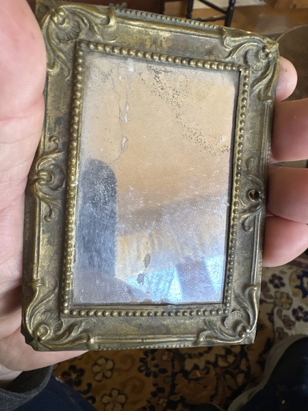 You don’t see this stuff much anymore. This is a pressed out brass frame traveling mirror original wood back just as the period 18th century frames were made . Look close at the age and condition untouched and only measuring 4 by 3 inches original mirror intacted .