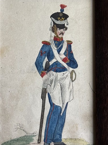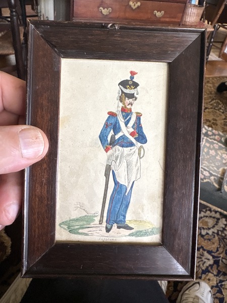 Great detail and very good condition. This watercolor measures by 4 by 6 inches old frame and dating 1820-1830 period. Note the leather tar bucket hat as well as sxe next to his side . Good overall condition . Early 19th century soldier.
