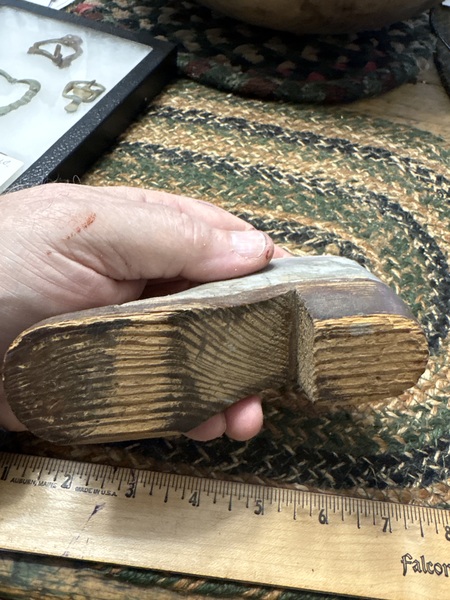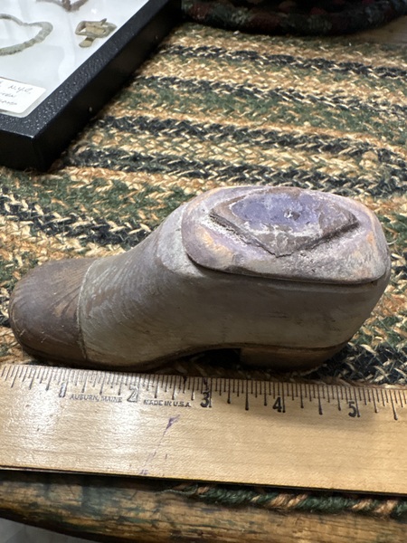 They don’t get much better measuring 5 inches in length and having all original dry surface . Lift off top carved and mounted with leather design on top and on under side to hold in place. Dry original gray and brown surface original painted table snuff box. Dating 1840 period the carving and paint is great look at the heal and shoe form . Early to mid 19th century piece of American pine folk art.