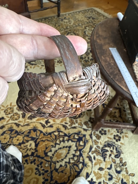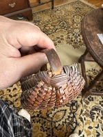 Nice all original small NY state basket . Miniature size in outstanding condition. Measures 4 by 3 inches with small bent wood splint handles all original and hard to find not broken.late 19th century I would guess