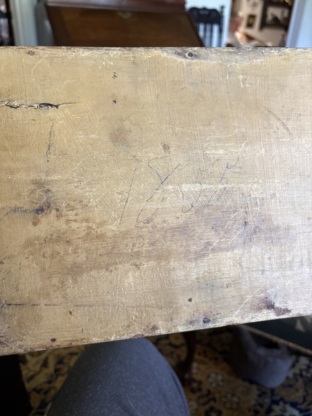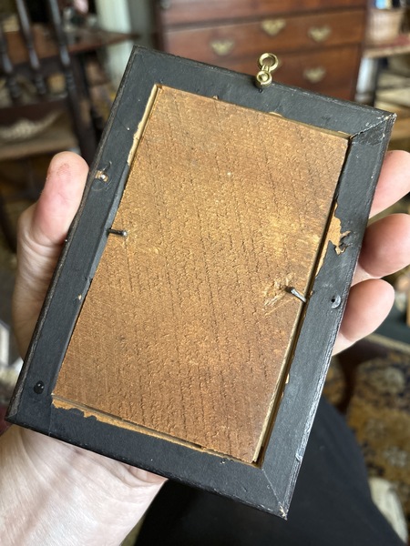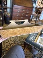 This looks to have several differant patterns. Hand colored and has a building on top which we don’t know what it is. Wall board frame and in worn condition. Measures 11 long by 7 wide by 5 inches tall . Just as found and dating 1830-1850.
