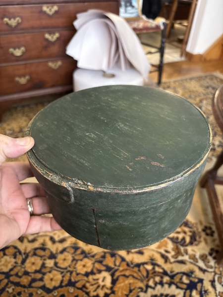 Thick wall untouched dry surface outstanding untouched condition early 19th century pantry box . Measures 7 1/8 across by 3 inches tall. Will be selling a fresh too the market group of painted pantry boxes all in super nice shape . Has good discoloration under lid . Wonderful early perfect pantry box . Strong grass green dry original surface.