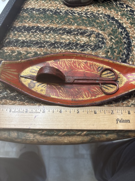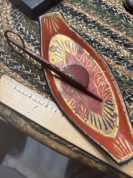 This is about the best I. Form color and condition. Normal wear and loss of red paint on iron snuffers but just look at the tray it’s outstanding. Measuring 9 inches long and love the toleware decoration on the tin tray. You just don’t see this in red from 1790-1810 period.