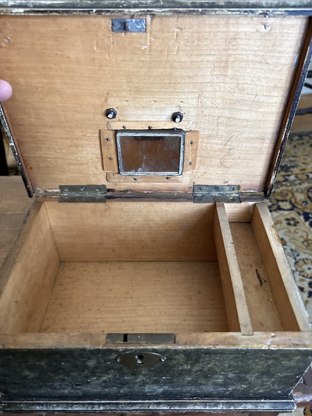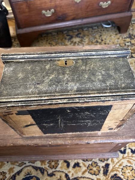 Great all original color hardware and paint. All original hinges and nail handle and lock inside. Love the small mirror that some mounted inside. Traveling box from New Hampshire that measures 11 by 7 1/4 by 5 tall nice all original untouched 1800-1830 period box . No issues