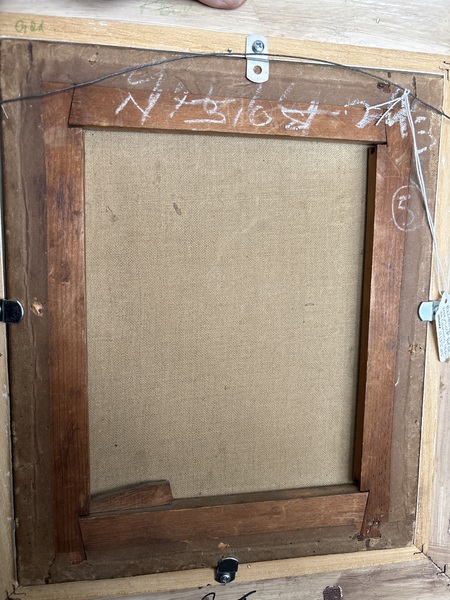 This has everything going for it. Never been out of the frame original backboard and nails . Strong detail and colors with no damage or staining. Measures 13 1/2 by 12 1/2 inches . All original with original name on the back as well. Great piece of American folk art.
