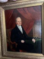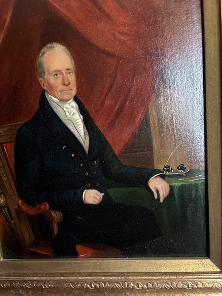 Outstanding all original portrait painting with super strong colors and detail. This American painting on canvas has no repairs or damage . Note !!!! A high quality new frame but without taking off the wall looks period. Dating 1830’s inside picture size is 9 3/4 wide by 11 inches tall . Has a nice writting desk set on table and detailed NEw York style chair regency . American early 19th century folk art.