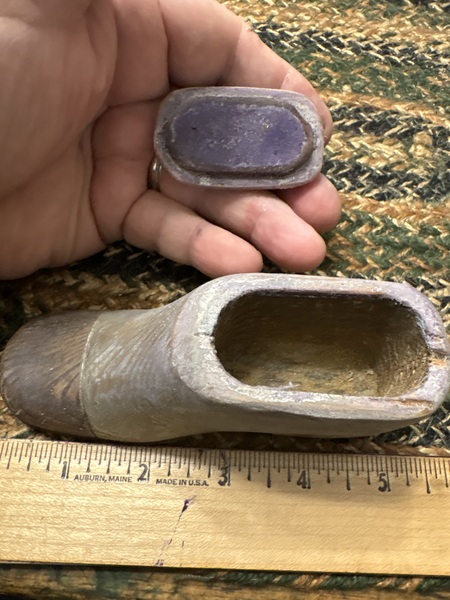 The black shoe is inlayed with pewter, and dating from the 1860 period. Perfect shaped shoe snuff box. The second shoe shaped snuff box is pewter and dating 1840-1860 measuring 1 1/2 inches with a heart design. Condition: both really nice shape
