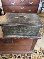 Outstanding in size and condition. This is only 9 inches long by 4 deep and 5 inches tall . Great initials and design in tacks. Inside lid has lots of writting hard too read. Oil cloth leather cover is great with light wear on back. All original and a true early 17th century form.