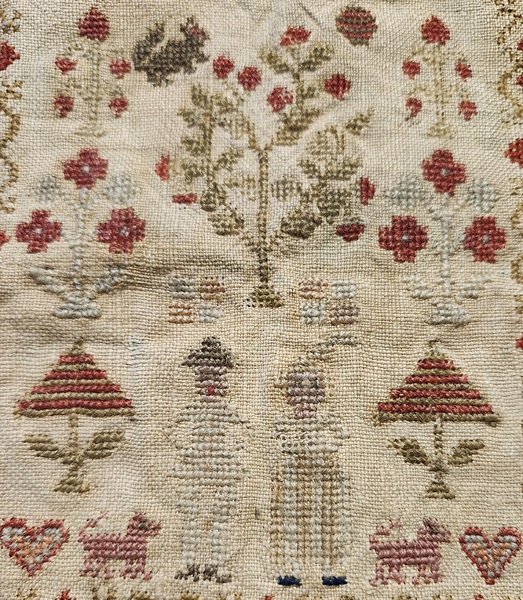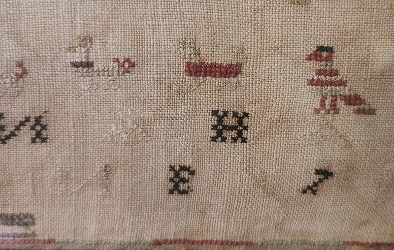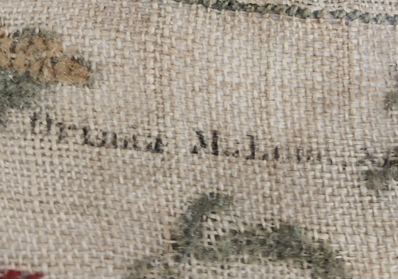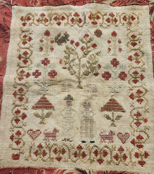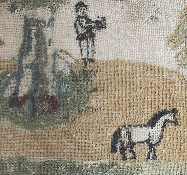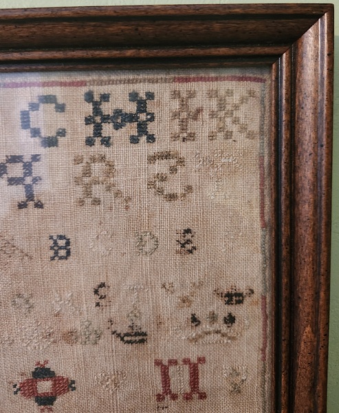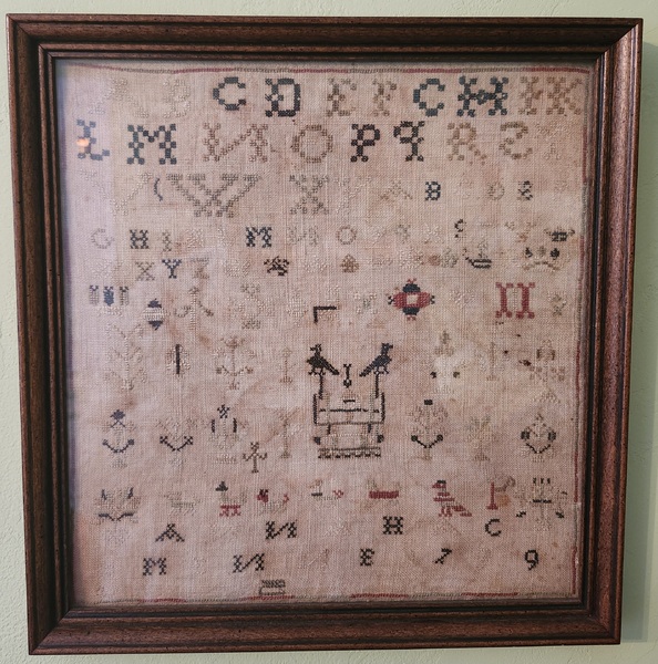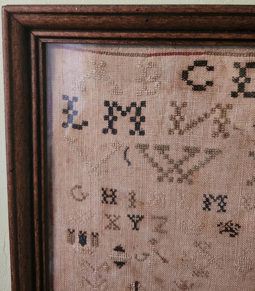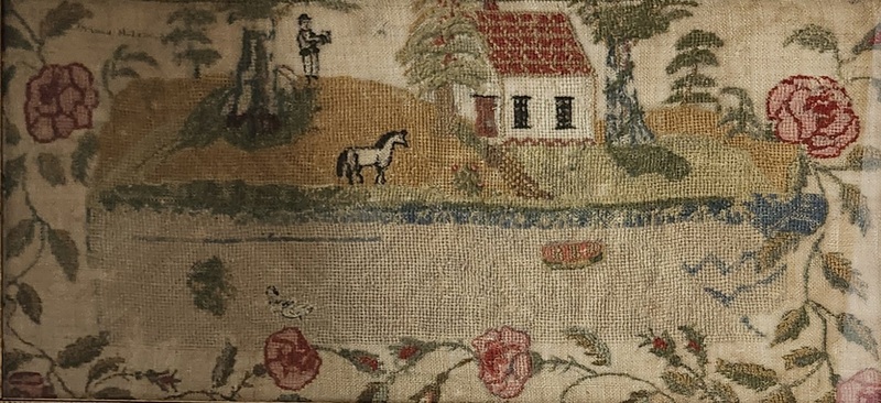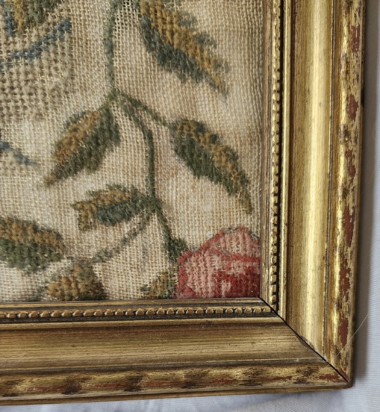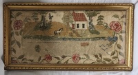 For sale is a very dear antique sampler, really a fragment, as it was once part of a larger piece, that I acquired in Nashville. I believe it is quite early, dating to the late 18th to early 19th century. I was immediately drawn to the horse, and there is also a man near a tree, and a house flanked by trees nearby. There is also a tiny swan near the bottom, and a floral garland surrounds 3 sides. There is also a tiny black ink signature near the top left that reads "Orinda(?) M. Lem(???). It is housed in a vintage gold leaf frame, and measures about 18 3/4" x 9 3/4" with sight measurements of 16 1/2" x 7 1/2". The piece is in nice but antique condition, with toning and areas of wear, but it displays very well. Please look carefully at the pictures, and contact me with any questions or for additional photos.