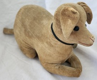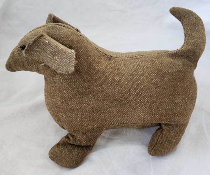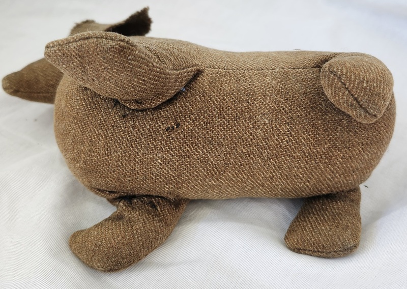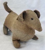 For sale is a darling vintage, possibly antique folk art brown wool Dachshund dog stuffed toy that I have had for a while. I think that he may be Amish, but I'm not positive. I believe he is all hand sewn, has black glass bead eyes, and is stuffed with cotton. The little guy measures about 8" long nose to tail, 5 1/2" tall, and 3 1/2" wide, and is in nice vintage/antique condition, with minor fabric wear and surface dirt, but no really significant issues. Please look carefully at the pictures, and contact me with any questions or for additional photos.