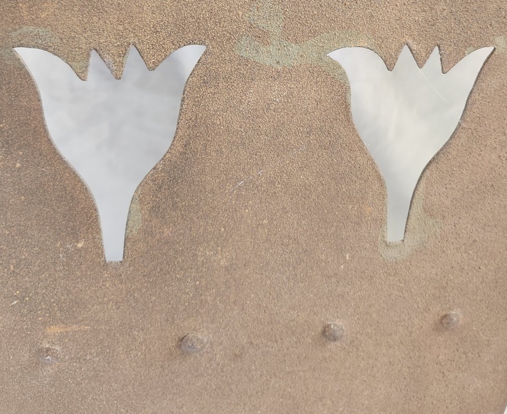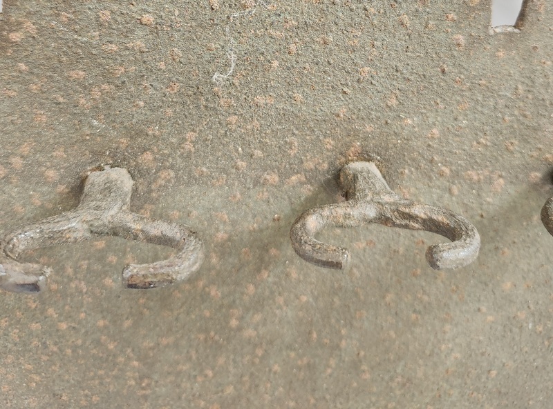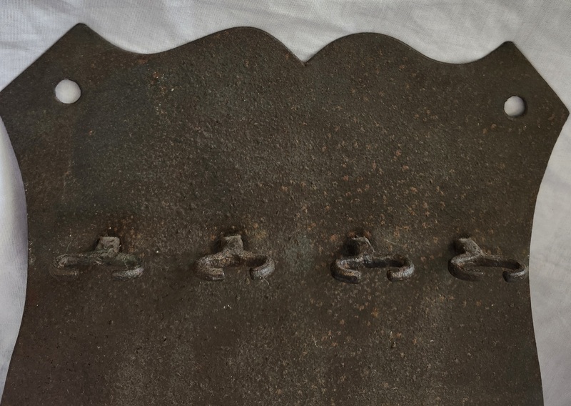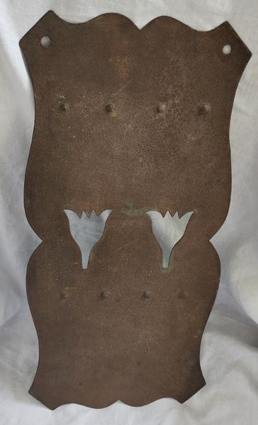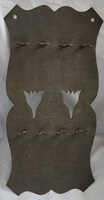 For sale is an unusual vintage folk art spoon rack that I acquired in Nashville. It is made of metal, has wonderful tulip cutouts, and each of the 8 hand wrought spoon holders is riveted in place. The piece measures about 22" long, 10 1/2" wide, and the spoon holders are each about 1 1/2" long and 1 1/4" deep. It is in nice vintage condition, with overall rust and pitting, and it almost appears to have random dots painted on the front, although I don't know for sure. It should also be noted that the closeups make the surface appear lighter than it is. The full length pictures show the most accurate depiction of the surface. Please look carefully at the pictures, and contact me with any questions or for additional photos.