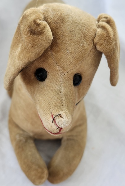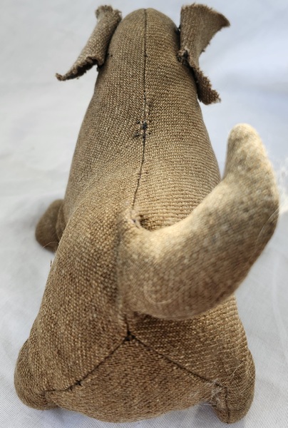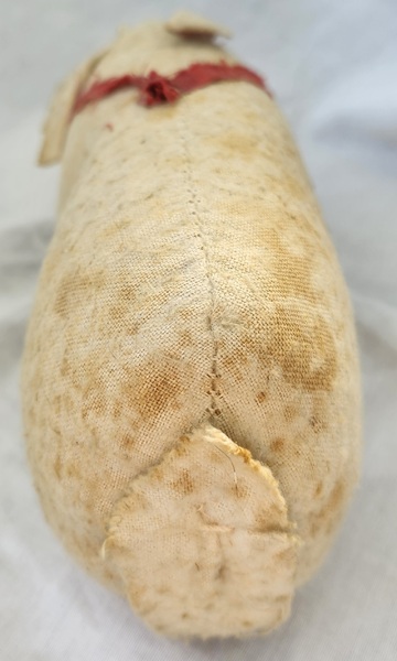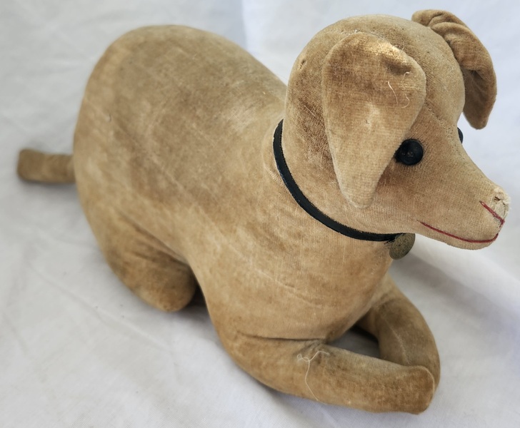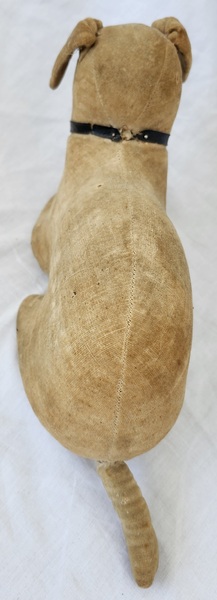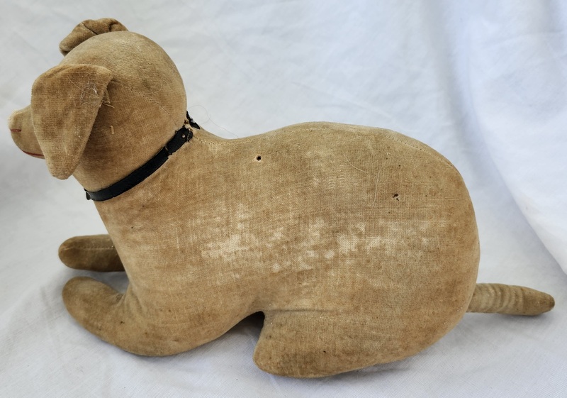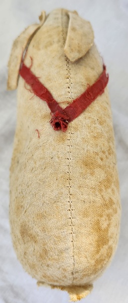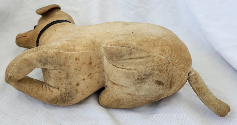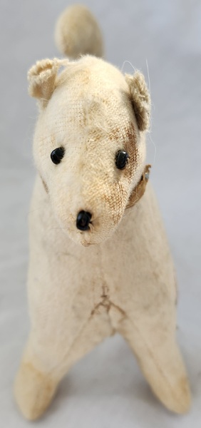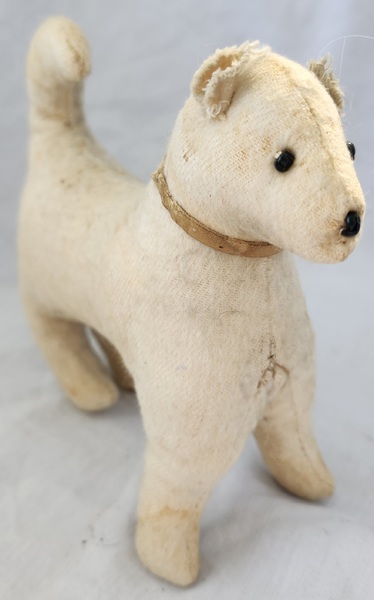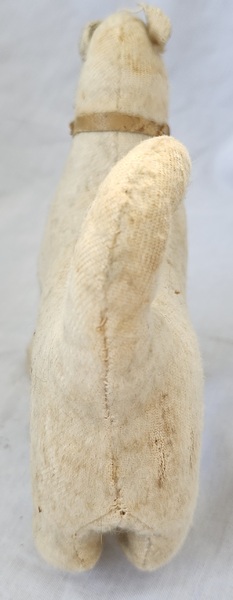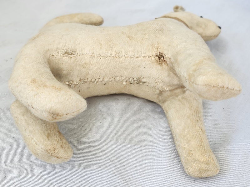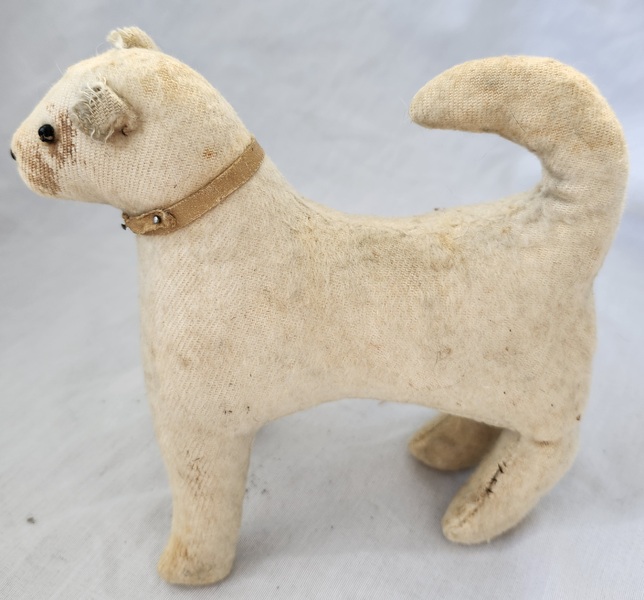 For sale is a very sweet and early white wool stuffed dog that I have had for a while. I think that he may be German, but I can't completely verify that. He is hand sewn, has black glass bead eyes and nose, a leather collar, and is most likely stuffed with cotton or wool The doggie measures about 6 1/4" long nose to tail, 6" tall, and 2 1/4" wide. He is in nice antique condition with fabric wear, overall toning, and some brown areas on the right side of his head, but no holes, rips, or repairs. Please look carefully at the pictures, and contact me with any questions or for additional photos.