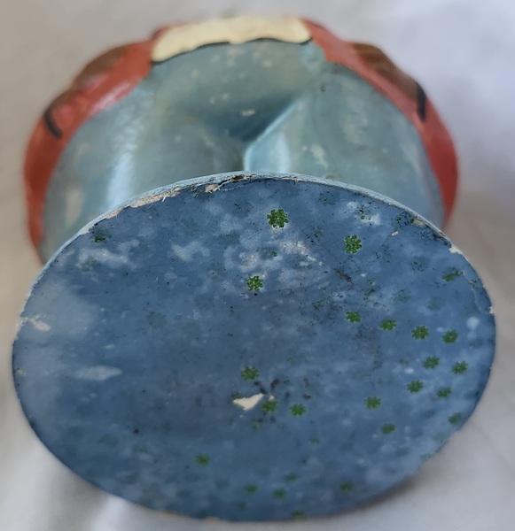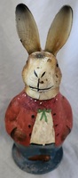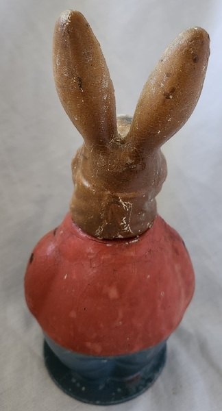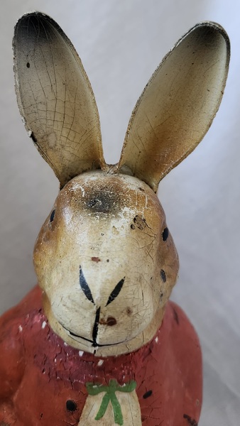 For sale is a terrific antique Easter rabbit candy container that has been in my collection for several years. Although unmarked, I'm certain it is German. The bunny wears a cute suit with a tiny bowtie, and the piece measures about 7 1/2" tall including the ears, and3" in diameter on the bottom. It is in nice antique condition, with some expected age appropriate wear and paint craquelure, but no really significant flaws. Please look carefully at the pictures, and contact me with any questions or for additional photos.