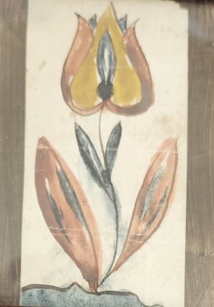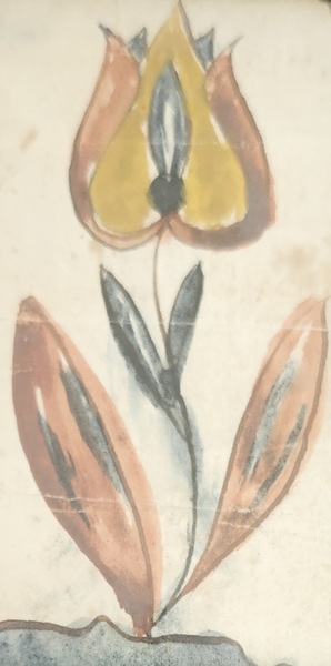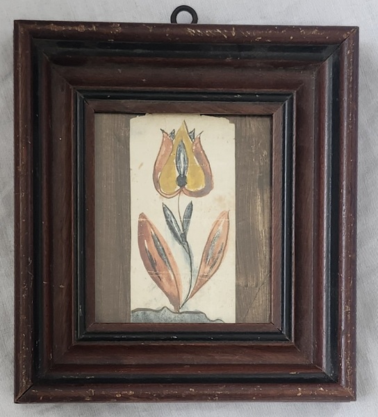 For sale is a very sweet and diminutive antique 19th century Pennsylvania folk art watercolor tulip fraktur that I acquired in Nashville from a Pennsylvania dealer. It has been mounted on acid free backing that has been painted brown, and is housed in an appropriate rather deep set frame that has a loop hanger at the top. The framed fraktur measures about 6" x 5 1/4", with sight measurements of 3 1/4" x 2 3/4", and the image itself is about 3 3/8" x 1 1/2". The piece is in nice antique condition, with some light toning and a few light spots, but it displays very well. Please look carefully at the pictures, and contact me with any questions or for additional photos. *****The last photo shows the fraktur out of the frame before the new backing was added.*****