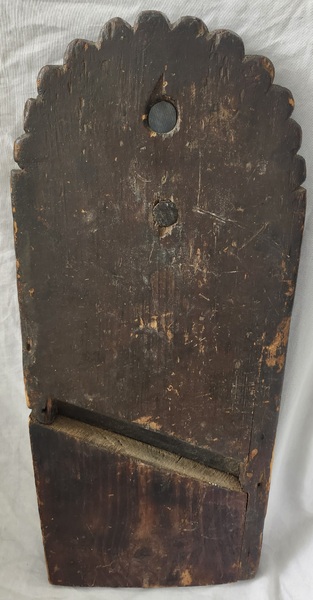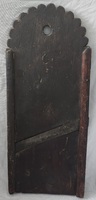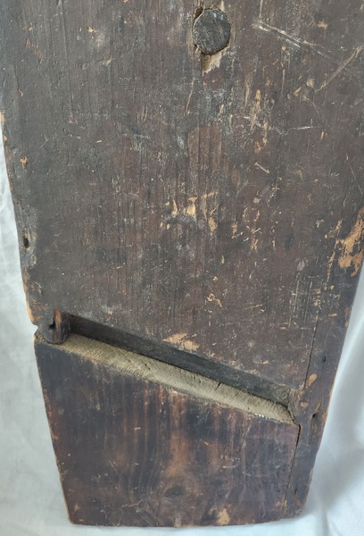 For sale is a wonderful antique 19th century primitive folk art Pennsylvania slaw or kraut cutter that has a unique scalloped tombstone top that has been in my collection for a couple of years. It is made of pine using square nails, and appears to be painted dark brown rather than stained. The piece measures about 20 3/4" long, 8 3/4" wide, and 1 1/2" front to back, and is in nice, but antique condition, with paint wear, rust, and pitting, as well as what looks like a knothole that was plugged when the piece was made. Please look carefully at the pictures, and contact me with any questions or for additional photos.