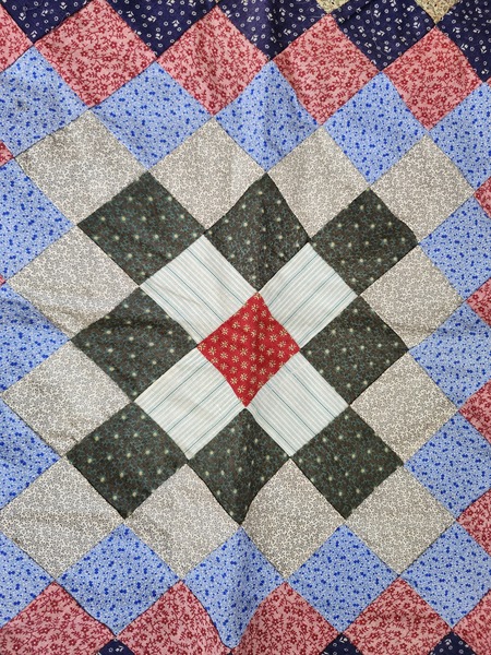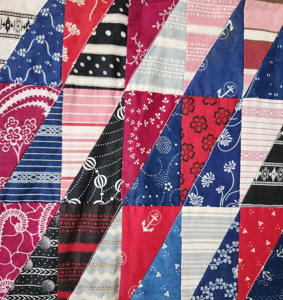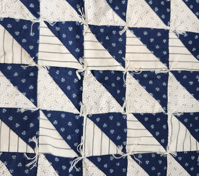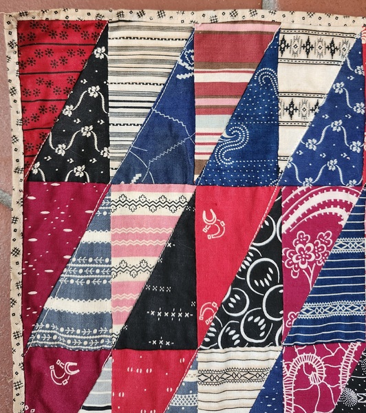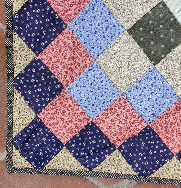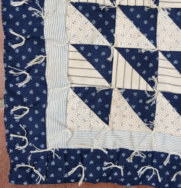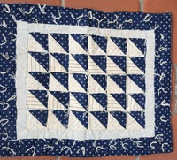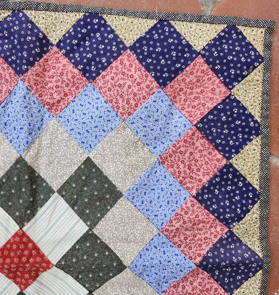 For sale is a charming antique double sided crib quilt that I acquired in Pennsylvania a couple of years ago. It is hand pieced, hand quilted, and hand bound in Americana colors in a variety of calico and striped fabrics. I believe it is very thinly filled with cotton batting, and measures about 42" x 34". The piece is in very nice antique condition, with only one tiny area of fabric damage that I believe is due to iron in the dye, which is shown in picture 5. I found no other flaws at all. Please look carefully at the pictures, and contact me with any questions or for additional photos.
