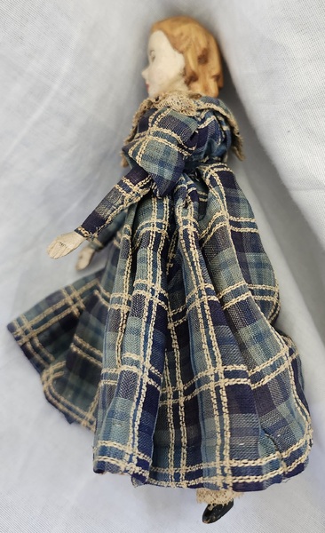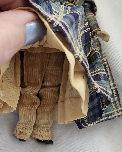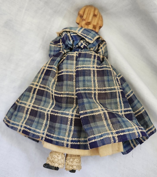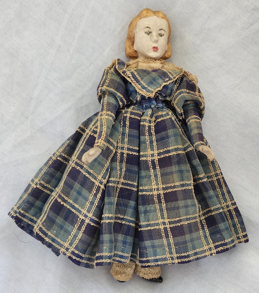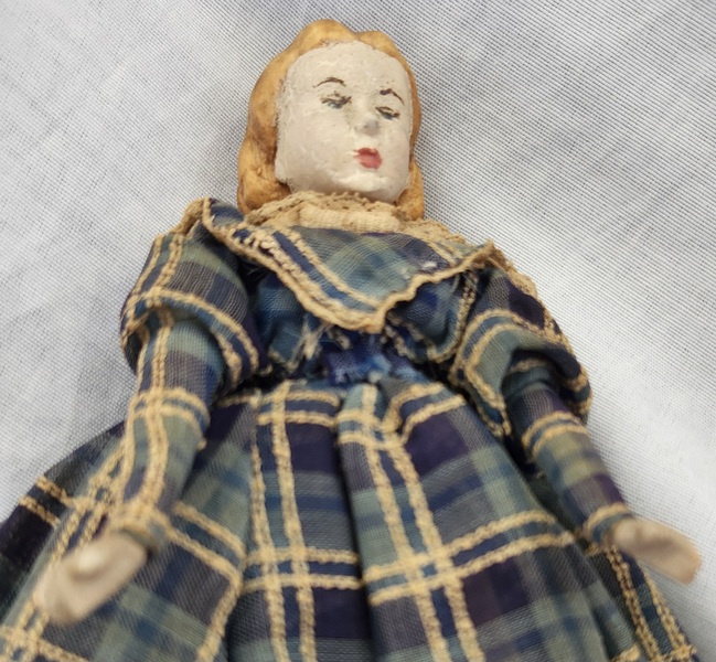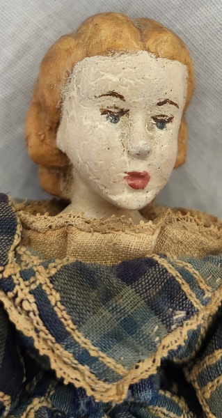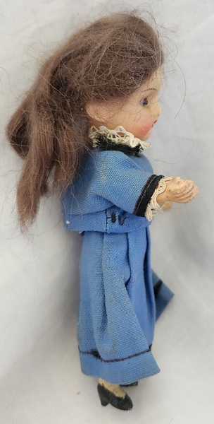 For sale is a very sweet small size antique folk art doll that came from New York state. The doll is completely hand carved including the head, the arms are articulated, and her face, shoes, and socks are hand painted. She is wearing her original dress and undergarments, and measures about 6 1/2" tall. The doll is in very nice antique condition, with minor expected wear, but no significant flaws. Please look carefully at the pictures, and contact me with questions or for additional photos.