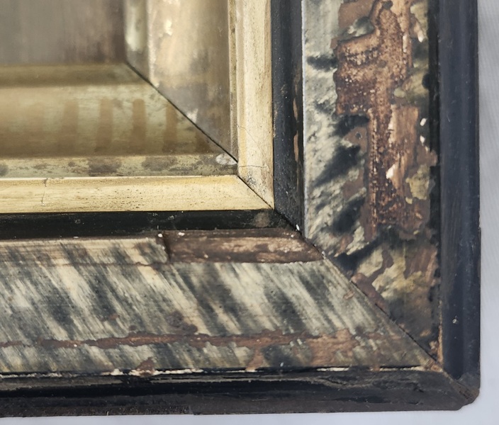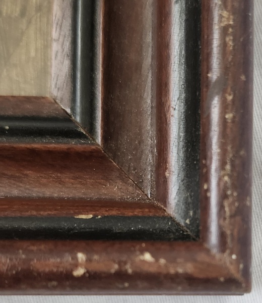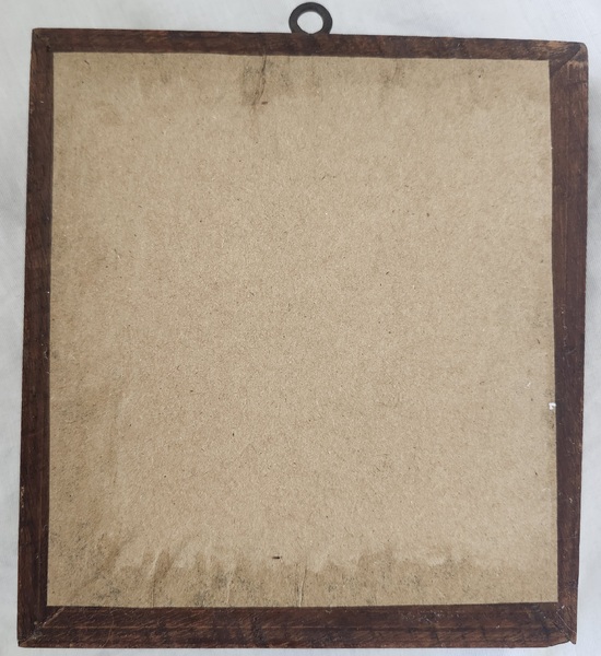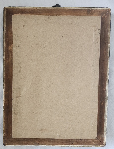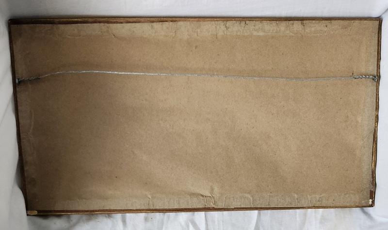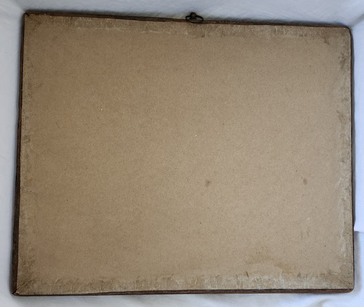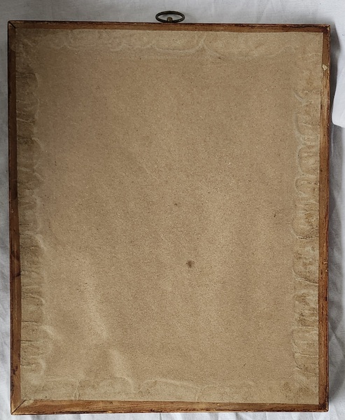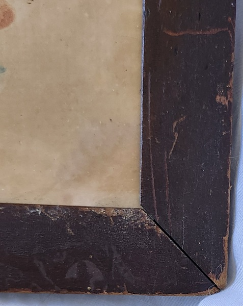 For sale is an antique folk art depiction of a young man courting a maiden by playing a stringed instrument, possibly a mandolin??? I acquired the piece in New Hampshire, and it is rendered on silk. The painting is housed in an appropriate period frame, and measures about 12 1/2" x 9 1/2" with sight measurements of 9 1/2" x 6 1/2". It is in nice antique condition, with toning and foxing, but no shredding, holes, rips, etc. The frame has an aged patina and minor wear. It should be noted that the painting was removed from the frame for inspection, and the last photo shows the back of the piece before the paper backing and wire hanger were replaced. My husband also placed the original framer's label back on as it originally was. Please look carefully at the pictures, and contact me with any questions or for additional photos.