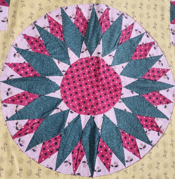 For sale is a very nice antique folk art stumpwork 6 petal flower design table mat, or possibly small lap robe. Each block is completed on a variety of different fabrics, measures about 6 1/2" square, and there are 30 squares in total. The backing fabric is black wool flannel, I believe. The entire piece measures about 39 1/4" x 33", and is in very nice antique condition. Please look carefully at the pictures, and contact me with any questions.