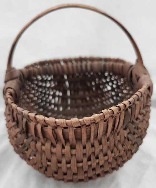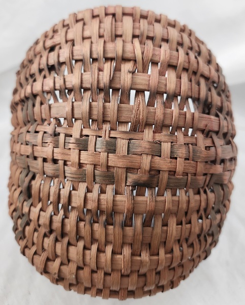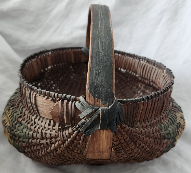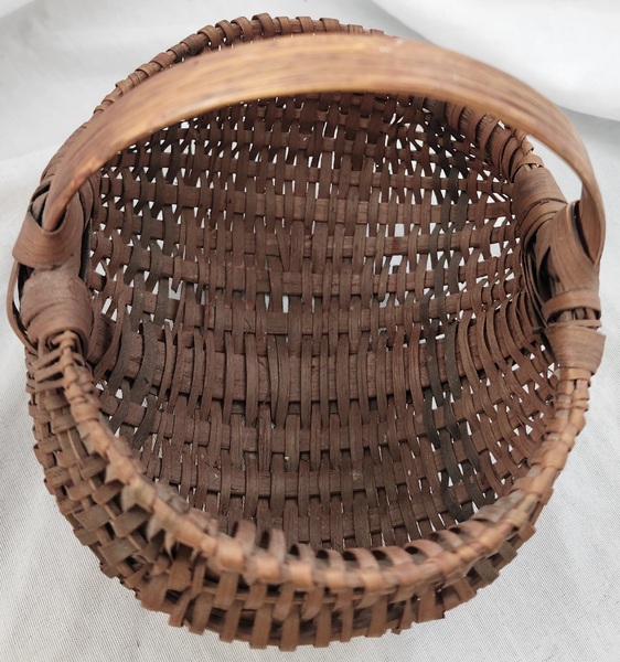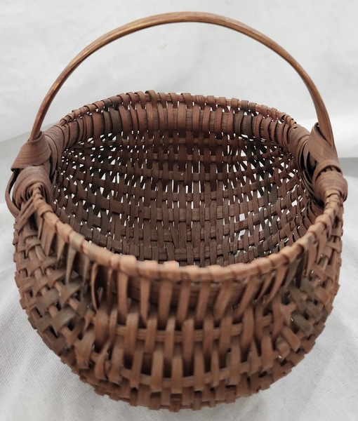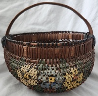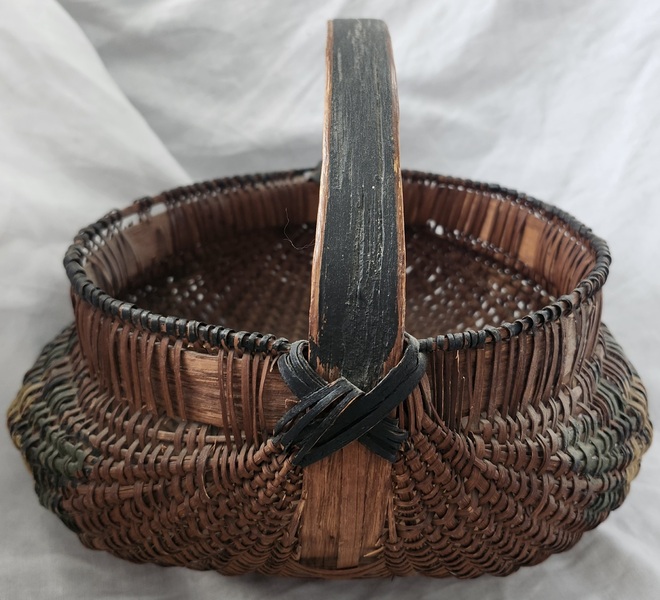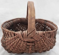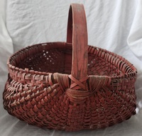 For sale is a very nice antique small size melon/buttocks basket that came from Ohio. It is stained red, and has dark brown stripes woven into the design. The stain is old, but I don't know for sure if it is original. The basket measures about 5" tall including the handle, 5 1/2" long, and 4 3/4" wide, and is in nice antique condition, with minor wear, but no significant flaws. Please look carefully at the pictures, and contact me with any questions or for additional photos.