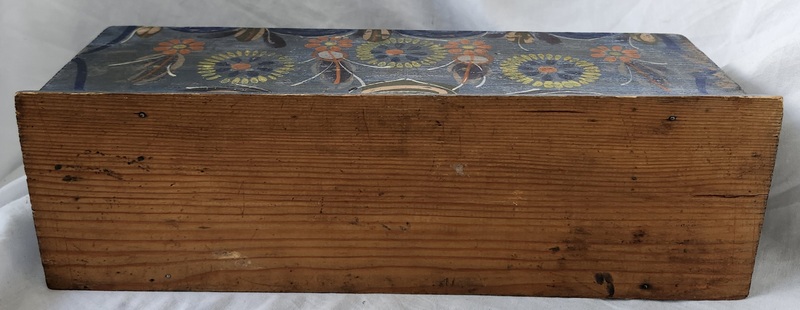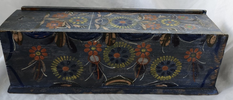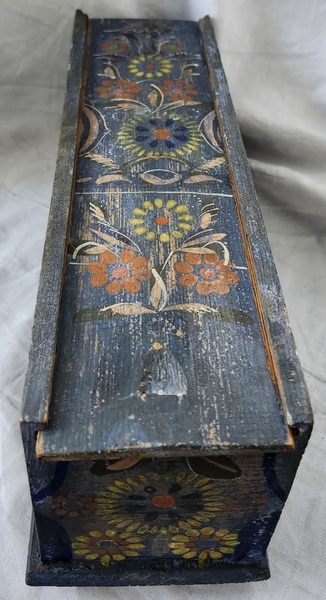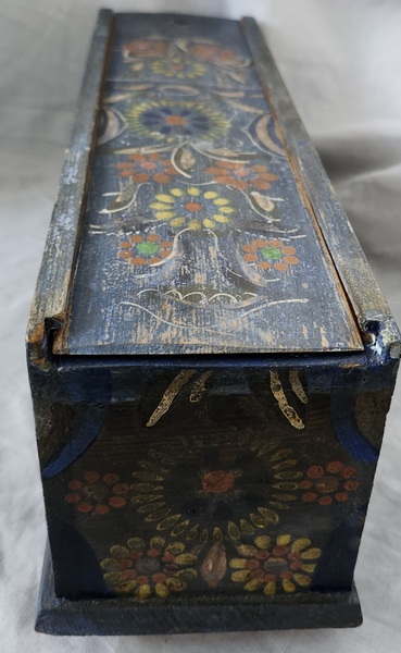 For sale is a terrific vintage Scandinavian folk art slide lid candle box that I acquired in Nashville. The background color is a fabulous cobalt blue, and the polychrome floral design is painted on all sides, and the bottom is unpainted. The box measures about 14 1/4" long, 4 1/2" wide, and 4 3/4" tall, and is in nice vintage condition, with expected minor signs of age and use, but no significant flaws. Please look carefully at the pictures, and contact me with any questions or for additional photos.