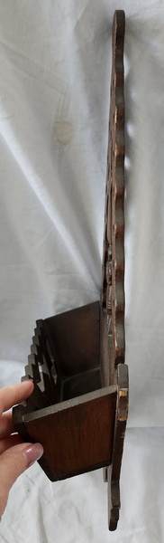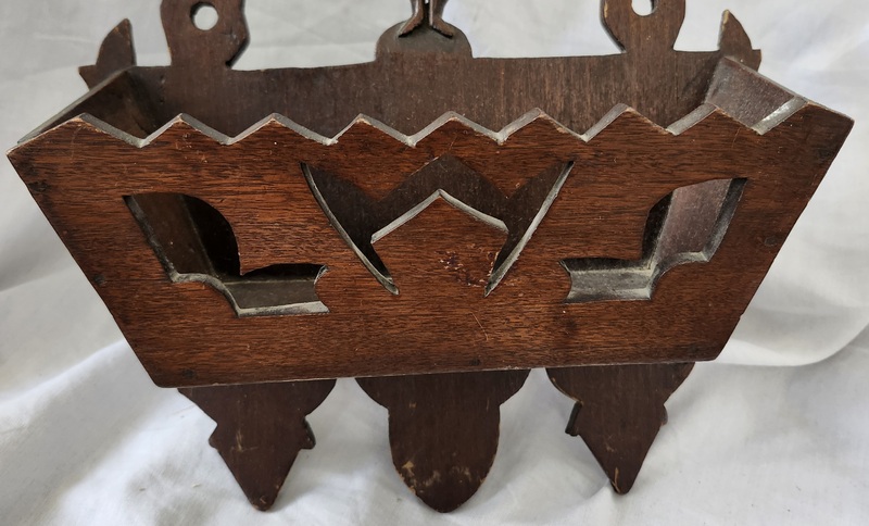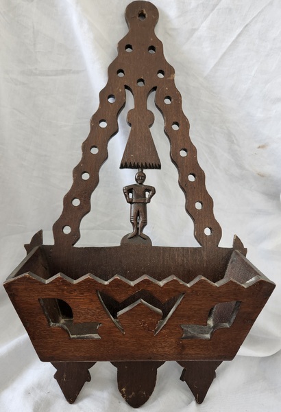 For sale is a very unique antique folk art carved wall box that has what appears to be a man dancing with a large tassel above him. I believe the wood is walnut, and there are other carved flourishes, and the piece measures about 19" tall, 10" wide, and 3 1/2" deep. It is in very nice antique condition, with a warm aged patina, but no chips, cracks, or repairs., Please look carefully at the pictures, and contact me with any questions or for additional photos.