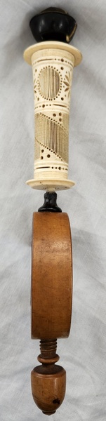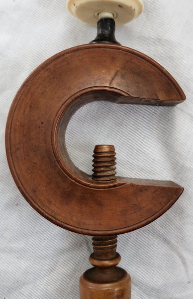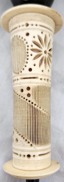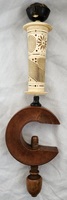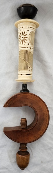 For sale is a fabulous 19th century folk sailor's art sewing clamp that is made of bone, baleen, and mahogany or similar hard wood that I acquired in Nashville from a Pennsylvania dealer. I would think that it was most likely made in New England or possibly England, although I can't completely verify that. the bone portion i wonderfully pierce anc carved, and there is a small pin cushion at the top that is made of baleen, I believe. There is also baleen in between the bone and the wood clamp, which has great form including a sort of acorn at the bottom. The piece measures about 10" long and is in very nice antique condition, with appropriate signs of age and a small relatively small area of damage to the baleen on the pin cushion. Please look carefully at the pictures, and contact me with any questions or for additional photos.
