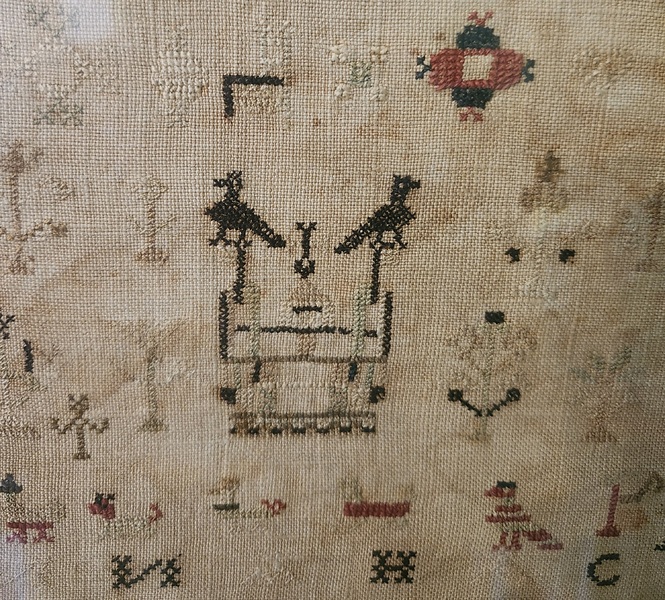 For sale is a wonderful and quite early antique dated 1794 sampler that was made by Mary NevillI that I believe is English. I think it is silk on linen, possibly homespun, and it has a variety of images including fruit/flower baskets, a row of what I believe are crowns, and a small bird with flowers(?) next to it. In addition, there are several lines of verse that say "Greatness in Virtue only's understood, None's truly great that is not truly good. On all occasions to declare the Truth, is most Praise Worthy in a virtuous Youth. I typed it with how we would read it today, but some of the "s's" are "f's" in the sampler as they would have been at that time. The sampler is housed in a wonderful old figured maple frame with a gold inner liner, although I don't think it is as old as the textile. The framed piece measures about 12 1/2" square with sight measurements of about 8 1/4" square. It is in nice, but antique condition with overall toning, and one area on the lower left corner with minor well concealed damage that is shown in picture #4. None of the stitching shows damage. Please look carefully at the pictures, and contact me with any questions or for additional photos.