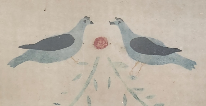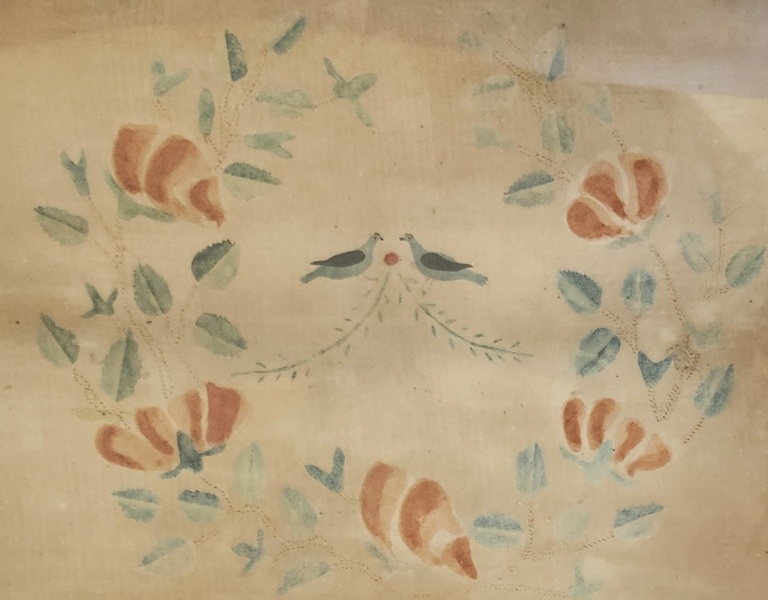 For sale is a very sweet antique watercolor fraktur on lined paper that depicts 2 large blue and gray birds and 2 smaller yellow and blue birds perched on a bowl of fruit(?) flanked by red stars and pink flowers. This charming piece has been in my collection for several years, but it's time to find a new owner. In addition, there is writing in the lower right corner, but I can't quite make it out, but I think it is a signature. I think it was made in Pennsylvania, but I don't remember for sure. The painting is housed in a period veneer frame with its original wire loop hanger, and measures about 7 1/2" x 5 3/8" with sight measurements of 5 1/2" x 3 3/8". The large birds are each about 2 1/2" long. The piece is in nice antique condition, with light toning and a few tiny spots, and the frame has minor age related wear. In addition, the piece was removed from the frame after I purchased it, and acid free cardboard was added before replacing the paper backing.