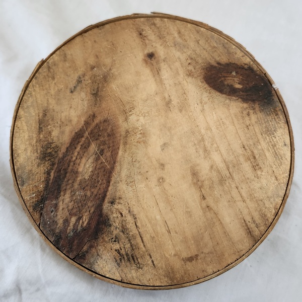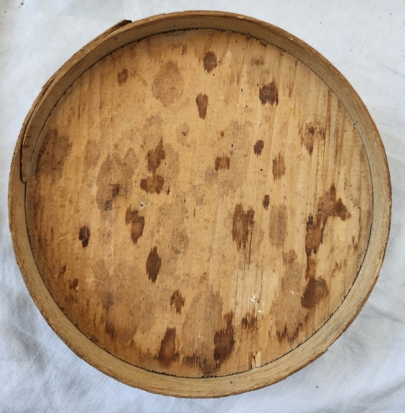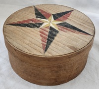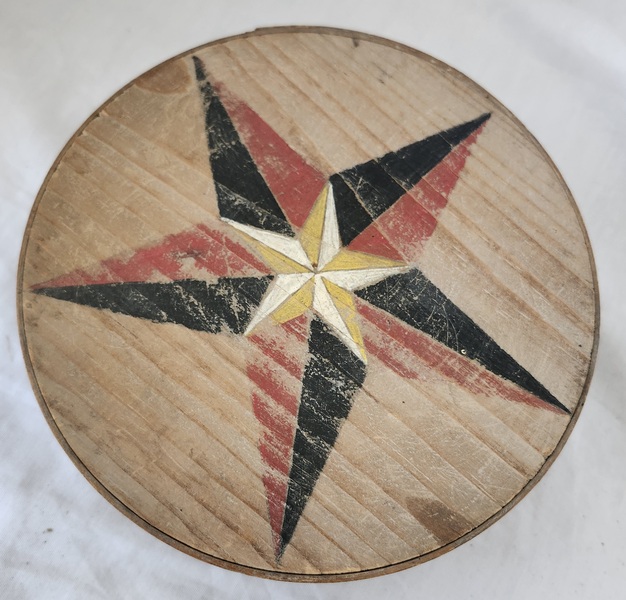 For sale is a unique antique folk art pantry box that I acquired in Iowa. On the lid, there is a painted double star design, with the larger star completed in red and black, and the smaller star in the center done in yellow and white. It also appears that the background of the lid has been very lightly whitewashed, and the rest of the box has been left unpainted. It measures about 6 1/2" in diameter and 2 3/4" tall, and is in nice antique condition with a warm aged patina, minor paint wear, and a bit of wear around the bottom of the box, but ho chips, cracks, or other issues. It should also be noted that there are numerous spots on the interior of both the box and lid, but I don't know what was in there that would have done that lol. Please look carefully at the pictures, and contact me with any questions or for additional photos.