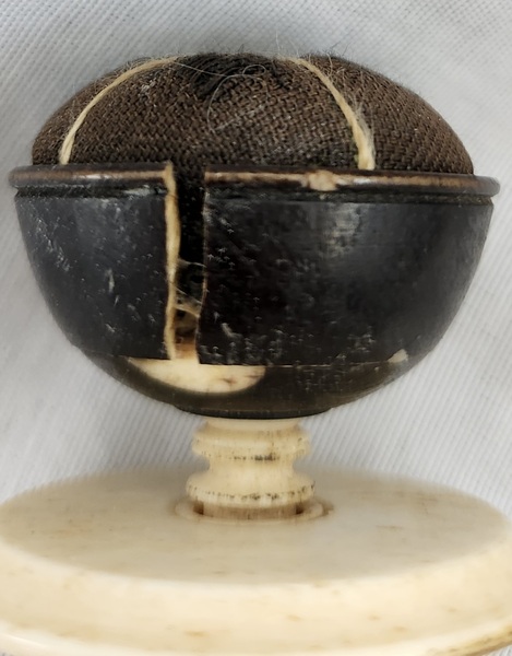 For sale is a very sweet and unusual antique pin keep, or possibly match holder, that was formerly in the collection of well known collector and dealer Pat Hatch. I believe that is made of mohair, has some kind of composition facial features, a ribbon around its neck, and is holding some kind of nut that holds the pins and needles, possibly a coquilla nut, although I don't know for sure. The inside of the bear appears to be wood as seen on the bottom, and the piece measures about 2 1/2" tall, 2" wide, and 2" front to back. It is in antique condition, with most of the mohair worn away, but no other significant issues. Please look carefully at the pictures, and contact me with any questions of for additional photos.