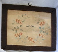 For sale is a very sweet antique 19th century folk art theorem painting that depicts a pair of bluebirds inside of a floral wreath with the title "The Wreath" at the bottom. I acquired it in Nashville, but the dealer was from Pennsylvania, so I think that it may have been made there as well, although I can't completely verify that. The painting is housed in a great antique frame, possibly original, with a metal ring hanger at the top. The framed piece measures about 15 1/2" x 13" with sight measurements of 12 1/2" x 10". The little birds are each about 1 1/2" long. The painting is in nice antique condition with overall toning, and one area of minor restoration that is shown in the 5th picture. In addition, the piece was removed from the frame for examination and acid free backing was added before replacing the paper backing. In addition, I believe the glass is relatively new. Please look carefully at the pictures, and contact me with any questions or for additional photos.