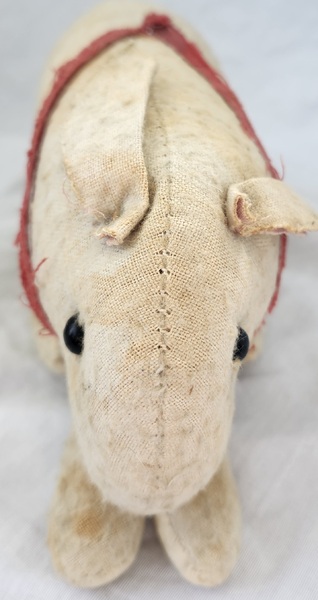 For sale is a very sweet antique velvet pig pin cushion whimsy that I acquired from a dealer friend in New York state. I believe he is hand sewn, he has tiny glass bead eyes, his tail has wire inside, and he is firmly stuffed, most likely with cotton or wool. The piece measures about 4" tall, 4" long nose to tail, and 2" wide, and is in nice antique condition, with some wear and surface dirt, and his right ear is missing. There also appear to have been a few minor repairs over the years, but there are no holes or rips. Please look carefully at the pictures, and contact me with any questions or for additional photos.