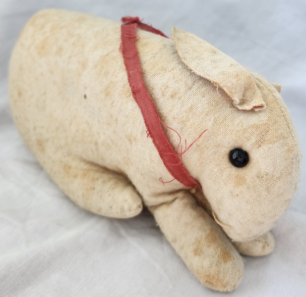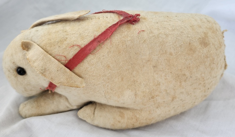 For sale is a very sweet antique folk art white wool stuffed rabbit that has been in my collection for a few years. I think that he may be Amish, but I can't completely verify that. He is hand sewn, has shoe button eyes, and a red linen sort of collar that is held in place with straight pins. In addition, his underside is linen. I believe that he is filled with sawdust, and measures about 8 1/2" long, 5 1/2" tall, and 3" wide. The bunny is in nice but antique condition, with fabric wear, toning, and brown spots, but at least in my opinion, he displays well. Please look carefully at the pictures, and contact me with any questions or for additional photos.