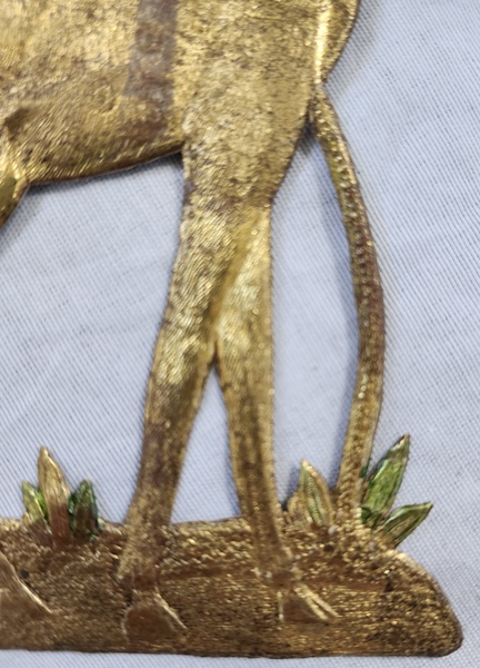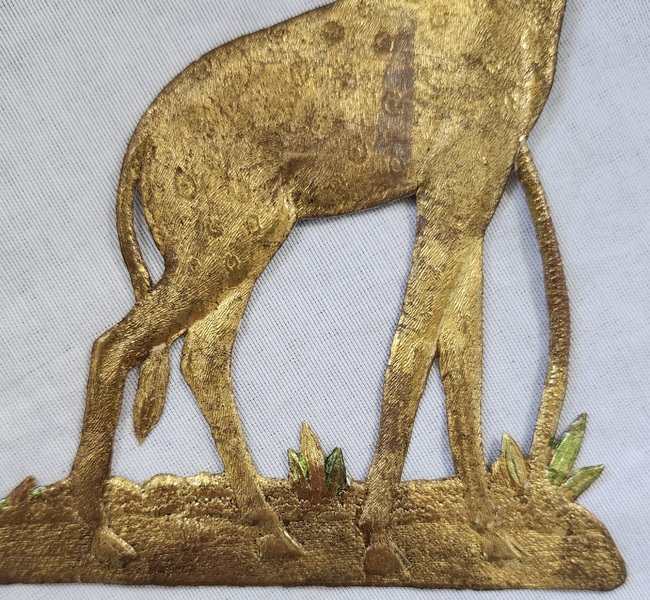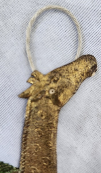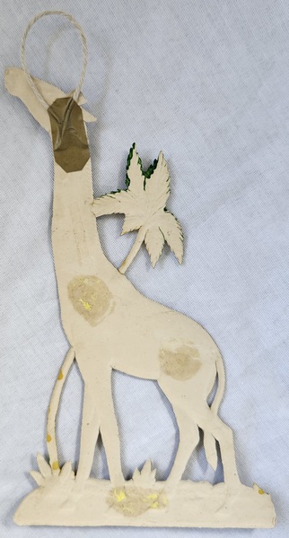 For sale is a very nice antique German pressed paper/cardboard giraffe ornament. The paper has a gold and green metallic surface, and measures about 6 1/2 " tall and 4" wide. It is in nice antique condition, with minor signs of age, but no significant flaws. Please look carefully at the pictures, and contact me with any questions or for additional photos.
