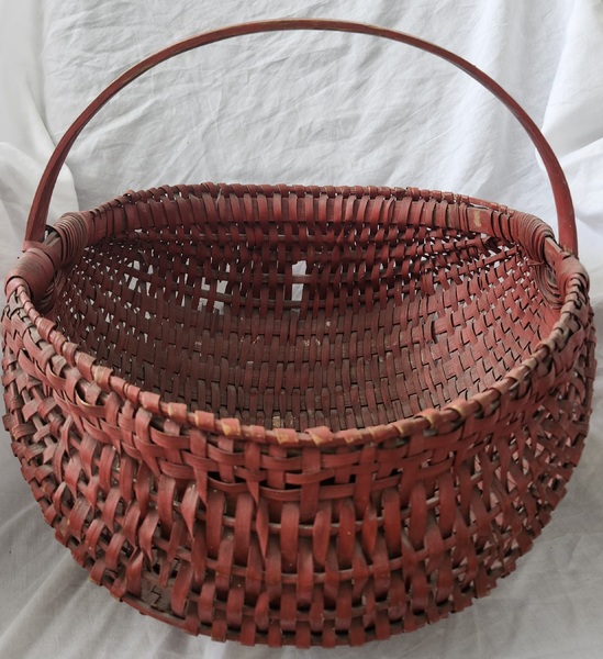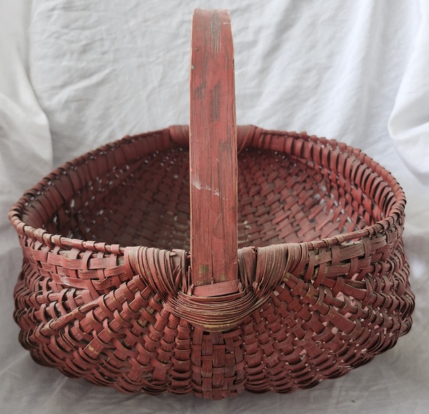For sale is a terrific antique buttocks basket in old, possibly original red paint that I acquired from a wonderful antique store run by the late Shane Hawkins in Cambridge City, Indiana. Shane was quite a well known dealer and collector, and had many wonderful primitives and folk art in his shop that I believe was called Log House Antiques. I also believe that it closed for a while after his death, but has since reopened, although I haven't been there. The basket measures about 13 1/2" in diameter on the top and 12 1/2" tall including the handle, and is in nice antique condition with minor paint wear, surface dirt, and a few small areas of minor damage, but no other significant issues. This is your chance to own a piece from a prominent collection. Please look carefully at the pictures, and contact me with any questions or for additional photos.
