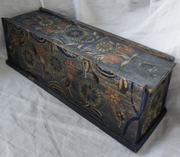 For sale is a fabulous antique Scandinavian folk art tine box that I acquired from a collection in Missouri. It has a terrific very stylized painted bird on a branch on the lid, and there are leaves and flowers around the perimeter. A fairly simple palette was used, and colors include black, white, yellow, grayish green, and blue. The box is constructed in the traditional way, with thin wooden strips used to hold both the box and lid together, as well as wooden pegs. The piece measures about 15 3/8" long, 9 1/2" wide, and 6 3/8" tall. It is in nice antique condition, with nice signs of age, including even wear where the lid was taken on and off, and a few missing pegs. It should also be noted that it has been reinforced with a few later nails, but the box is very solid. Please look carefully at the pictures, and contact me with any questions, or for additional photos.