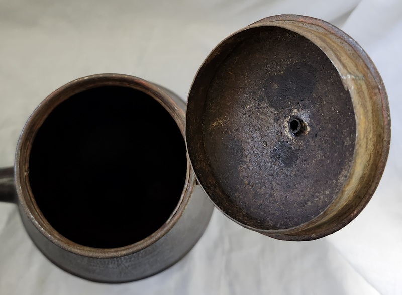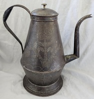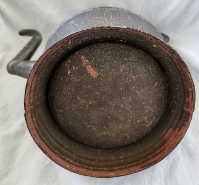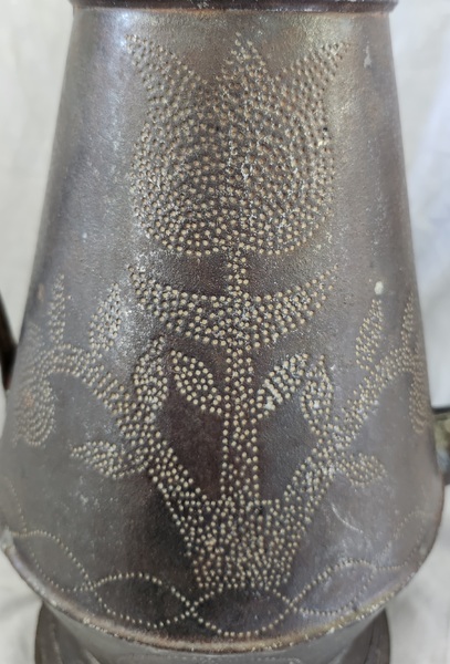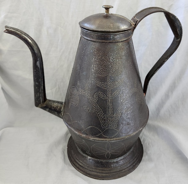 For sale is a wonderful antique 19th century Pennsylvania folk art punched tin coffee pot that was formerly in the collection of Yvonne and Carl DePaulis. It has potted tulips on both side with a sort of chain design below, and there are radials around the bottom portion. It measures about 12" tall and 6 3/8" in diameter on the bottom, and is in very nice antique condition, with a warm aged patina and expected rust. It should also be noted that the spout has been professionally restored as shown in picture 3. Please look carefully at the pictures, and contact me with any questions or for additional photos.