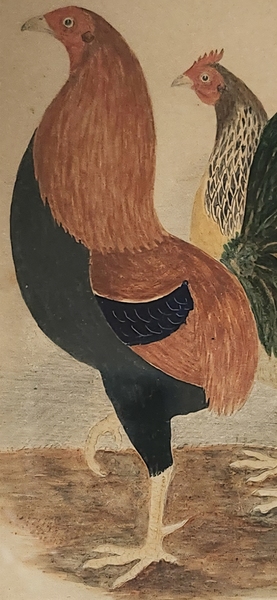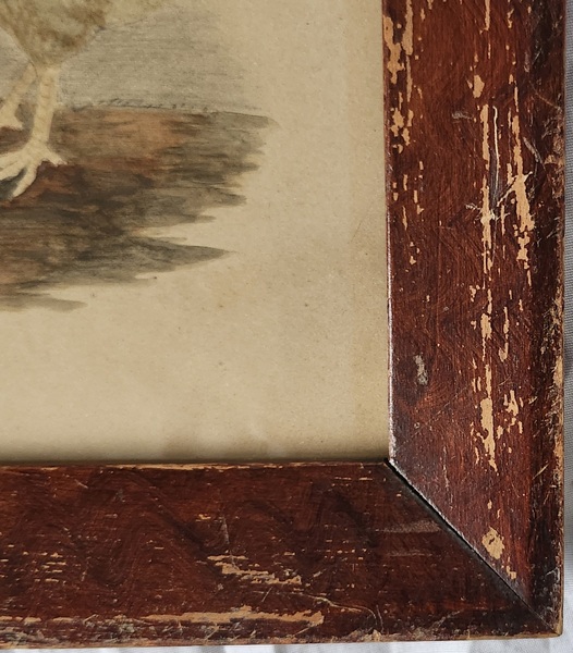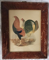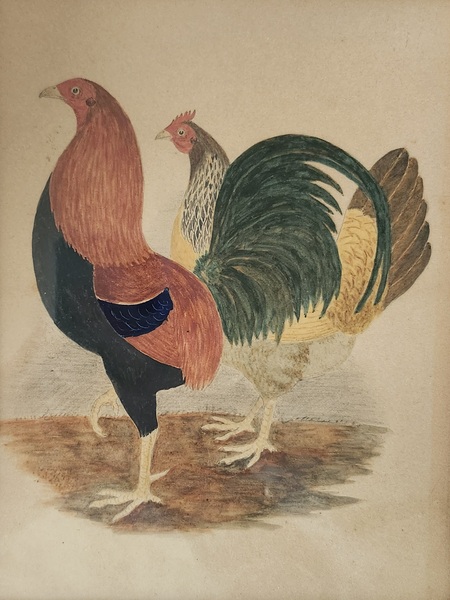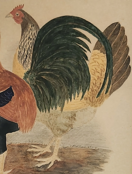 For sale is a wonderful antique 19th century folk art watercolor painting of a rooster and hen. It came from Tennessee, and I believe was most likely made there as well. It is housed in a terrific, possibly original faux painted frame with the original glass and metal hanging loop. The painting measures about 11 1/4" x 9 1/4" with sight measurements of 8 1/2" x 6 1/2". The image itself is about 6 1/4" x 5 1/2". The painting is in nice antique condition, with no notable issues on the painting, and expected age related wear on the frame. It was removed from the frame for examination, and acid free backing was added, and so of course, the paper backing is new. Please look carefully at the pictures, and contact me with any questions or for additional photos.