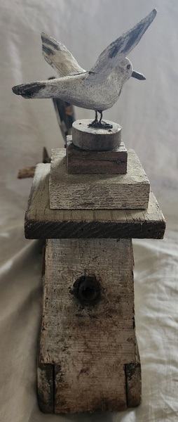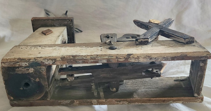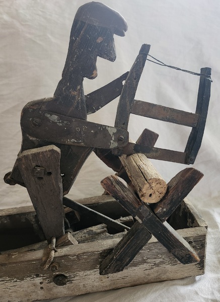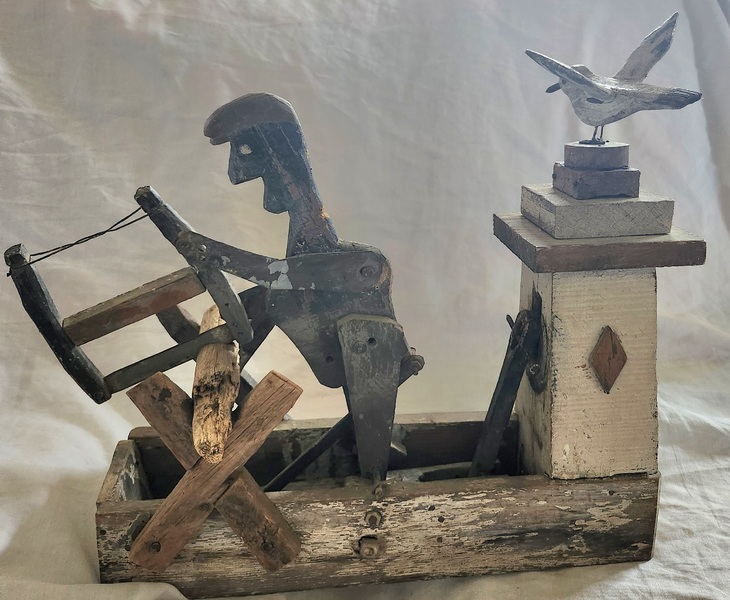 For sale is a very naive antique, most likely early 1900's to possibly the 1930's, folk art whirligig that depicts a Black Man sawing wood with what looks like a seagull perched on a sort of lighthouse style perch behind him. It has been in our collection for many years, but it's time to find it a new home. It is painted white, black, and brown, and has the initials "WDL" near the back on the bottom of one side. It measures about 14" tall, 14 1/4" long, and 4" wide, and is in antique condition, with the propellers long gone, significant paint wear, and other signs of having been outside for a long time. The man does move if you push him. Please look carefully at the pictures, and contact me with any questions or for additional photos.