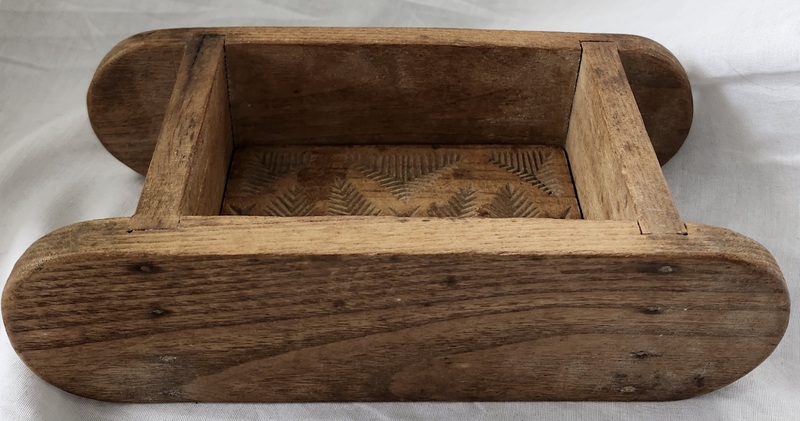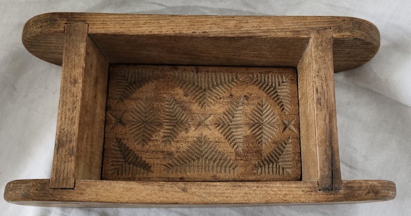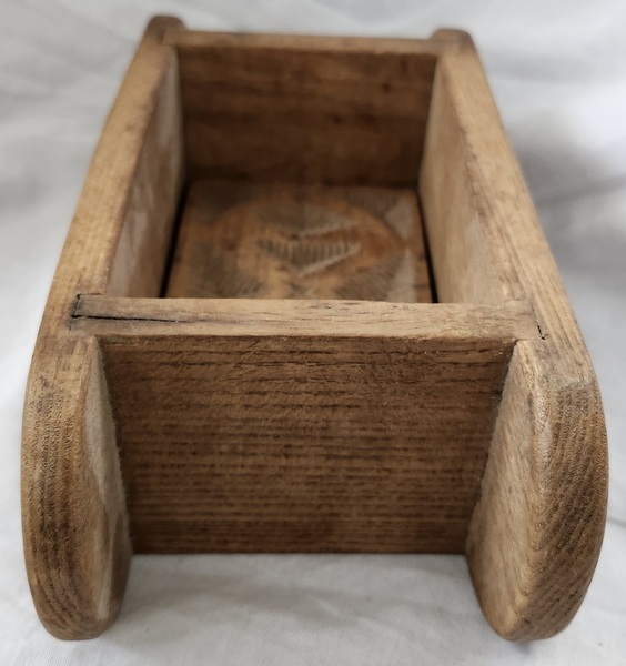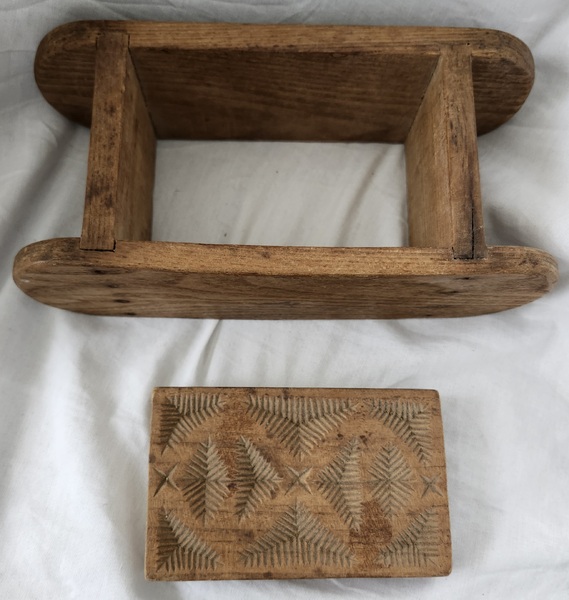 For sale is an antique 19th century Pennsylvania folk art box form butter print that I acquired in Atlanta, but that had formerly belonged to a PA . collector. The design is deeply carved in a rather abstract design in diamonds, triangles, and 4-point stars. The box is mortised and held together with what looks like hand cut nails. The piece measures about 9" long, 4 1/4" wide, and 2 3/4" tall, with the actual print measuring about 5" long, 3 1/8" wide, and 15/16" thick. It is in nice antique condition, with a warm aged patina, but no significant issues. Please look carefully at the pictures, and contact me with any questions or for additional photos.