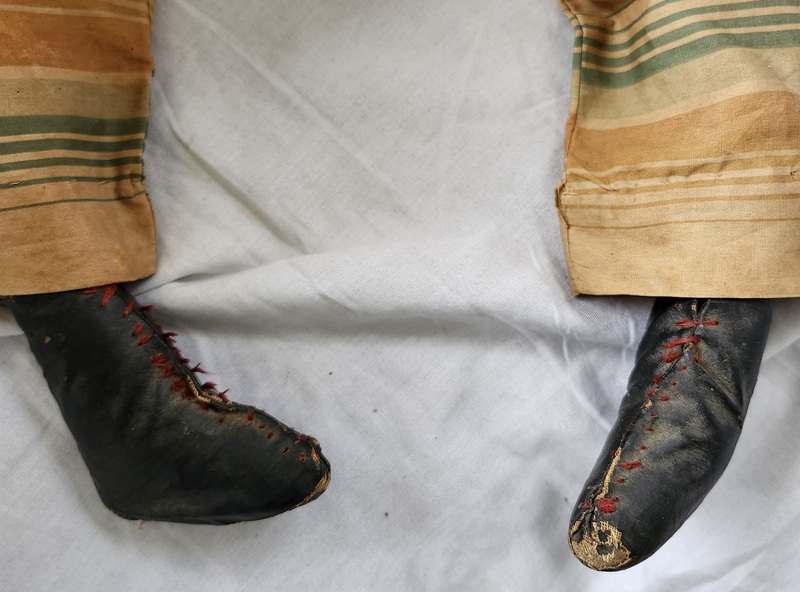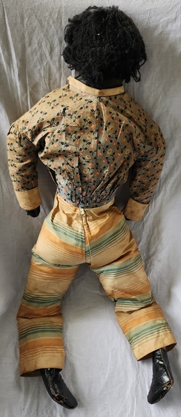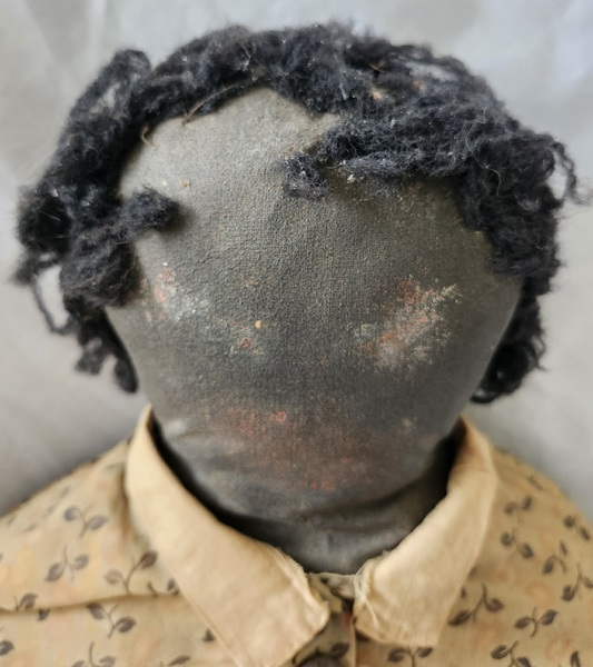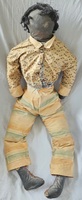 For sale is a large antique Black Americana folk art male rag doll that came from New York state. I was told that he dates from the 19th century, and based on his clothing, I think that is probably accurate. I believe he is made of linen and canvas, has very crudely painted facial features, black wool yarn hair, and is wearing his original clothing. It should be noted that his shirt can be removed, but his pants are sewn in place. The doll measures about 30" tall, and is in antique but displayable condition, with fading, particularly on his shirt, which now appears tan, but was originally blue, as well as some areas of wear on his hands, boots, and hair. There are no holes in his body or clothing. Please look carefully at the pictures, and contact me with any questions or for additional photos.