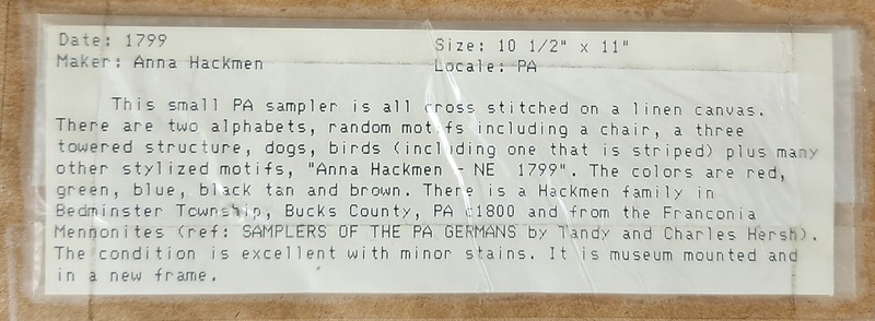 For sale is a wonderful small size dated 1799 pictorial sampler with provenance indicating that it was made in Bedminster Township, Bucks County, Pennsylvania by a girl named Anna Hackman. (Please read the information in the last picture). The sampler is silk on linen, and has versions of the alphabet, as well as numerous other pictorial images including dogs, birds, and more. It is housed in a newer but appropriate frame, and measures about 12 1/2" x 11 3/4" with sight measurements of 11" x 10 1/4". The sampler is in very nice antique condition, with light toning, but no significant flaws. Please look carefully at the pictures, and contact me with any questions or for additional photos.