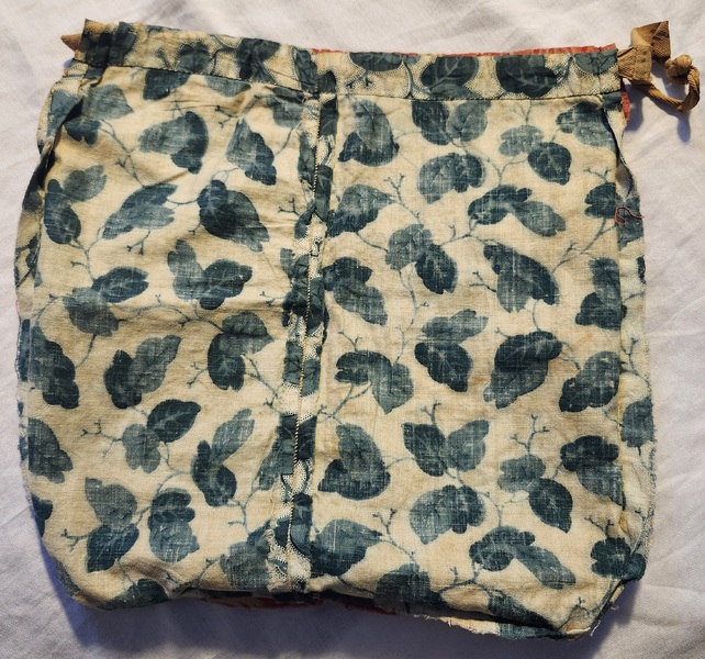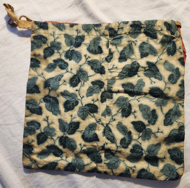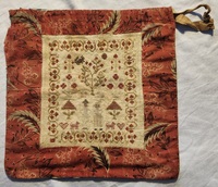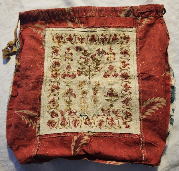 For sale is a very dear and I believe rare, antique early 19th century folk art fabric bag that has a tiny sampler sewn on the front. It was formerly in the collection of Stanley and Andrea Hollenbaugh of East Berlin, Pennsylvania, and I have never seen anything even remotely similar to it before. It could be American or English, I don't know for sure. The sampler is silk on homespun linen, and depicts a man and woman in colonial garb, flanked by dogs, hearts, and trees. Above the couple is a tree which is flanked by flowers, and above that , there are 2 flower trees, and a sweet little squirrel on the left. The whole design is framed in the traditional strawberry vine border. The bag is completely hand sewn and hand embroidered, and the sampler is framed with a beautiful red feather print fabric, while the back is a teal blue and cream/beige leaf print. The original drawstring is still present, and the bag measures about 9" square. The bag is in near mint condition, with no holes, rips, stains, or repairs, and the last 2 pictures are of the bag turned inside out. Please look carefully at the pictures, and contact me with any questions or for additional photos.