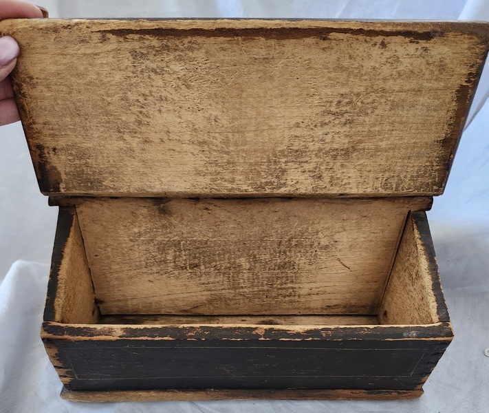 For sale is a wonderful antique 19th century primitive miniature chest that I acquired from a sale in Pennsylvania, and that may have been made there as well, although I can't completely verify that. It is hand dovetailed, and retains an old yellow painted surface. Interestingly, there are shadows of what appear to be decoupage, and there are still pieces of decoupage on the interior of the lid. The piece has black painted ball feet, and measures about 14" long, 8 1/2" wide, and 10" tall. It is in nice antique condition, with minor paint wear, but no significant flaws. Please look carefully at the pictures, and contact me with any questions or for additional photos.