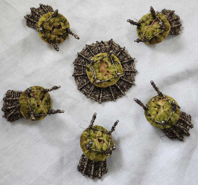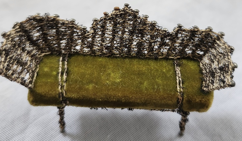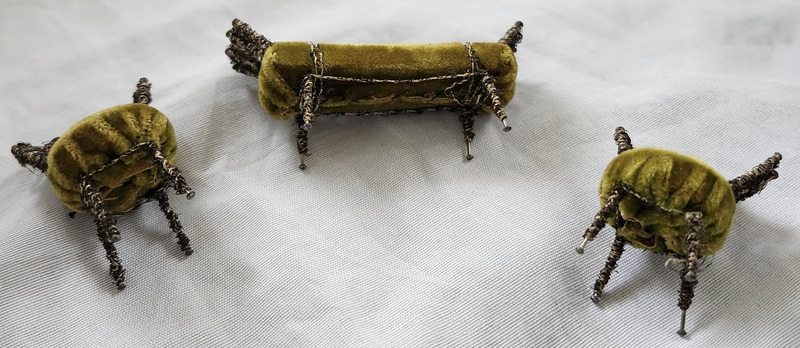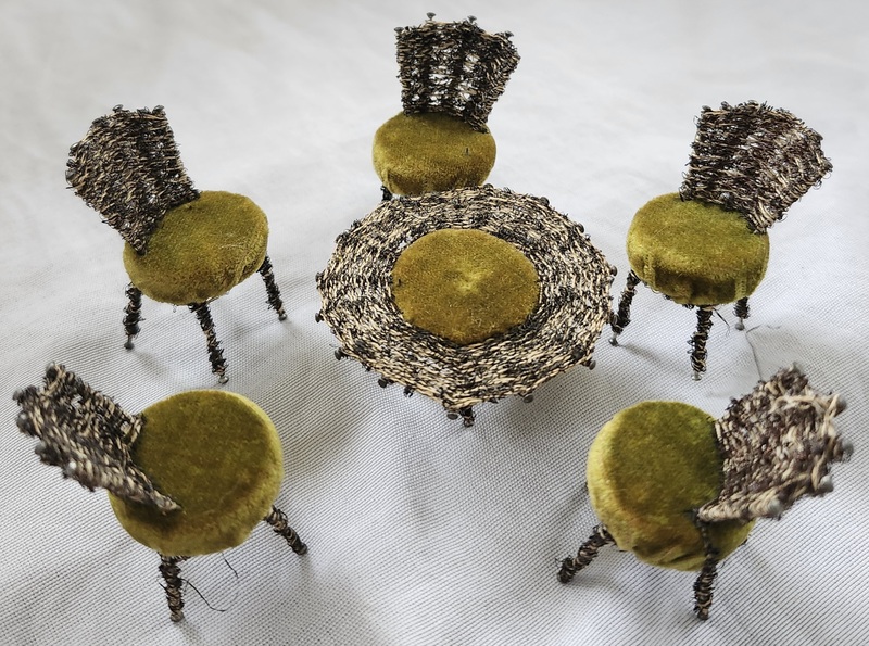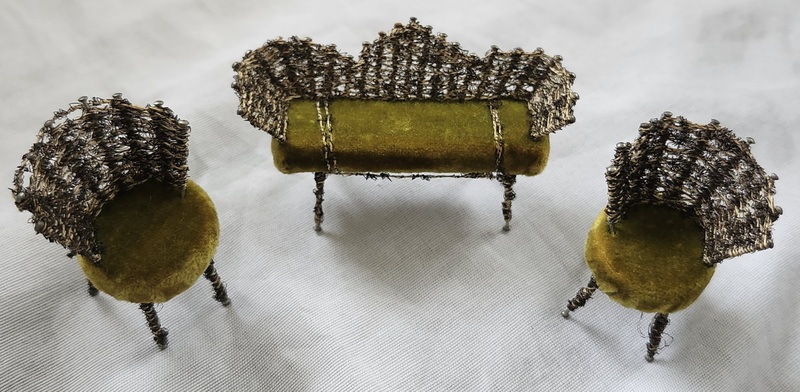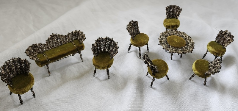 For sale is a very sweet set of 9 pieces of antique folk art doll furniture that came from New York state. Included in the set are a couch/settee, a round table, and 7 chairs. Each is handmade to resemble wicker using wire, thread, straight pins, and velvet. The couch measures about 2 3/4" long, 1 1/2" tall, and 3/4" deep, the table is about 1 3/4" in diameter and 1" tall, and the chairs are about 1 1/2" tall, 1" in diameter, and 1" deep. All pieces are in nice antique condition, with minor signs of age, but no really significant flaws. Please look carefully at the pictures, and contact me with any questions or for additional photos.