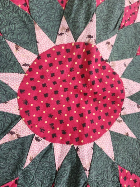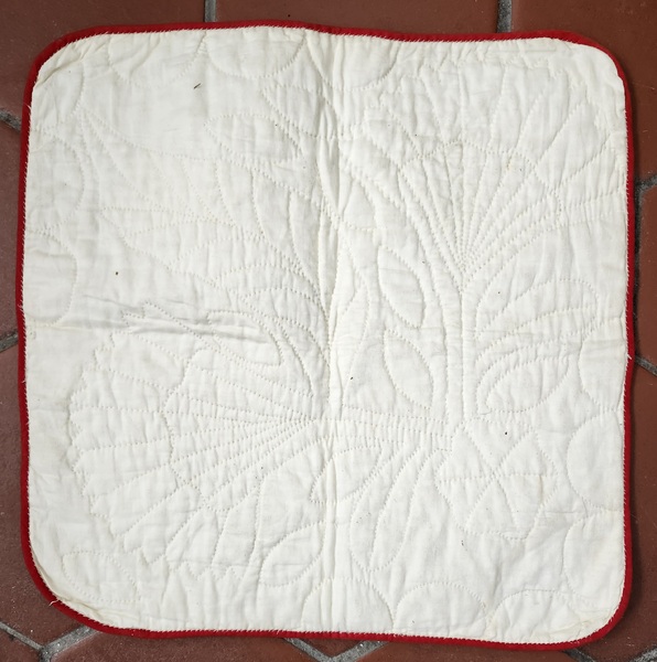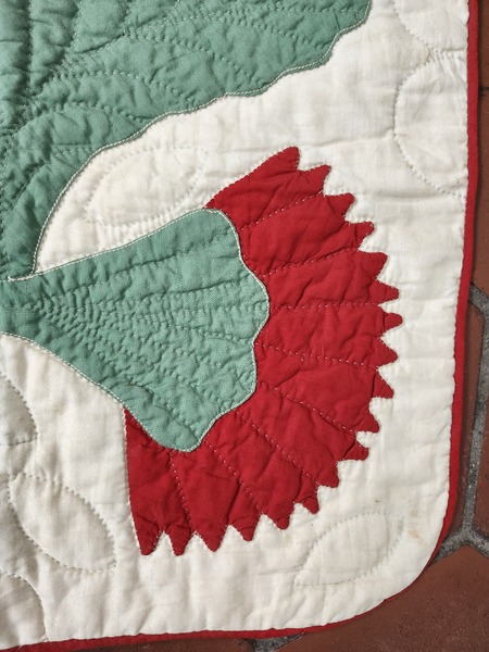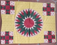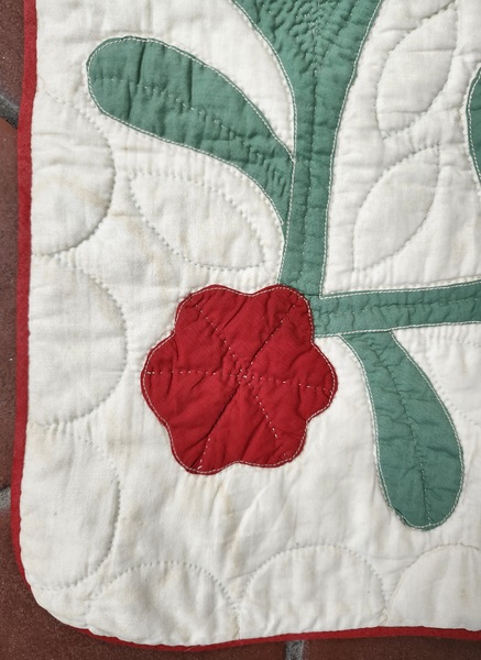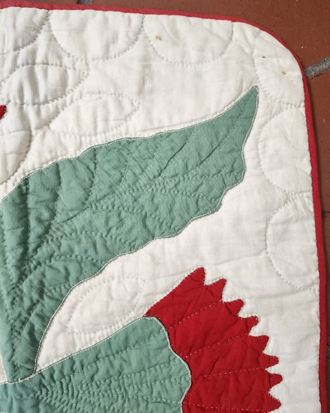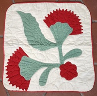 For sale is a very sweet old doll quilt or table mat that has an appliqued design of cockscomb flowers. I acquired it in Nebraska, and it is both hand and machine appliqued, hand quilted, and hand bound. It is filled with cotton batting, and measures about 17" square. It is in very nice vintage condition, with a few tiny spots, but no really significant flaws. Please look carefully at the pictures, and contact me with any questions.