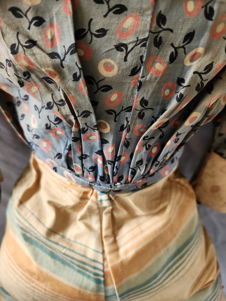For sale is a wonderful antique lady's dress that I believe is made of brown homespun that I acquired a few years ago in Ohio. It was made for a tall and thin woman, and has ruffled sleeves, a ruffle below the waist, and 3 rows of ruffles at the bottom. Approximate measurements are as follows: length - 61", waist - 27", bust - 35", neck opening - 6" across, sleeve length - 22", and sleeve opening - 4 1/2" across. The dress is in antique condition, with a few small holes and areas of repair, the most noticeable of which are on the elbow area of both sleeves. However, at least in my opinion, the dress is very worthy of display, and the imperfections are a testament to its age and use. Please look carefully at the pictures, and contact me with any questions, or for additional photos.